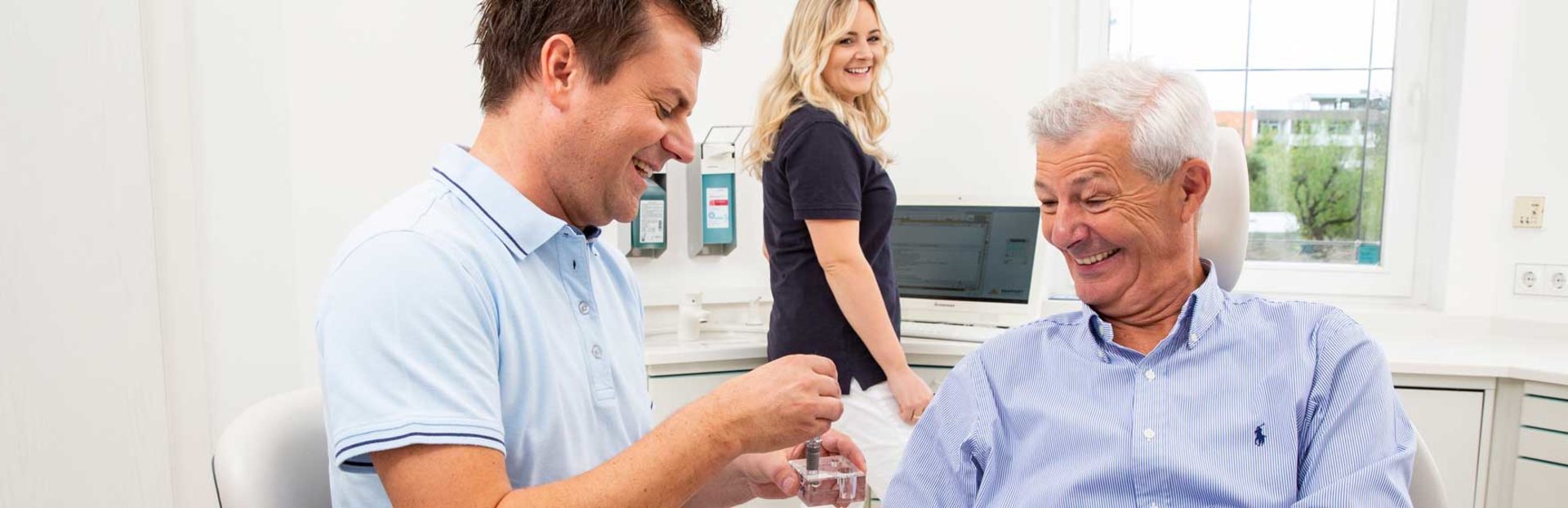 Die Implantologie zählt bereits seit Jahren zu unseren Tätigkeitsschwerpunkten. Sie ist ein zahnmedizinisches Fachgebiet mit qualifizierten Spezialisten für das schonende Einsetzen von Implantaten in Ober- und Unterkiefer – für festen Biss und Zähne. Die Zahnärzte Dr. Thomas Kerling M.Sc. und Christoph Meier verfügen über viel Erfahrung in der oralchirurgischen Implantologie und beraten Sie gerne zu Zahnimplantaten und Ihren Möglichkeiten.